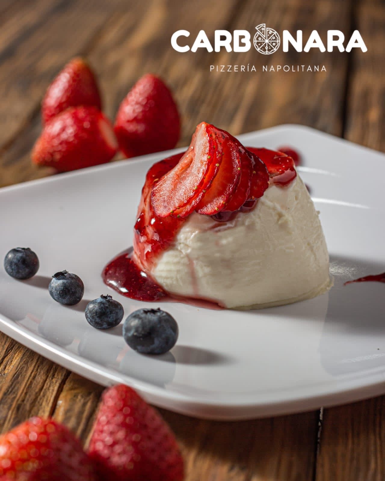 gelatina cremosa acompañada de salsa de frambuesa con frutos rojos