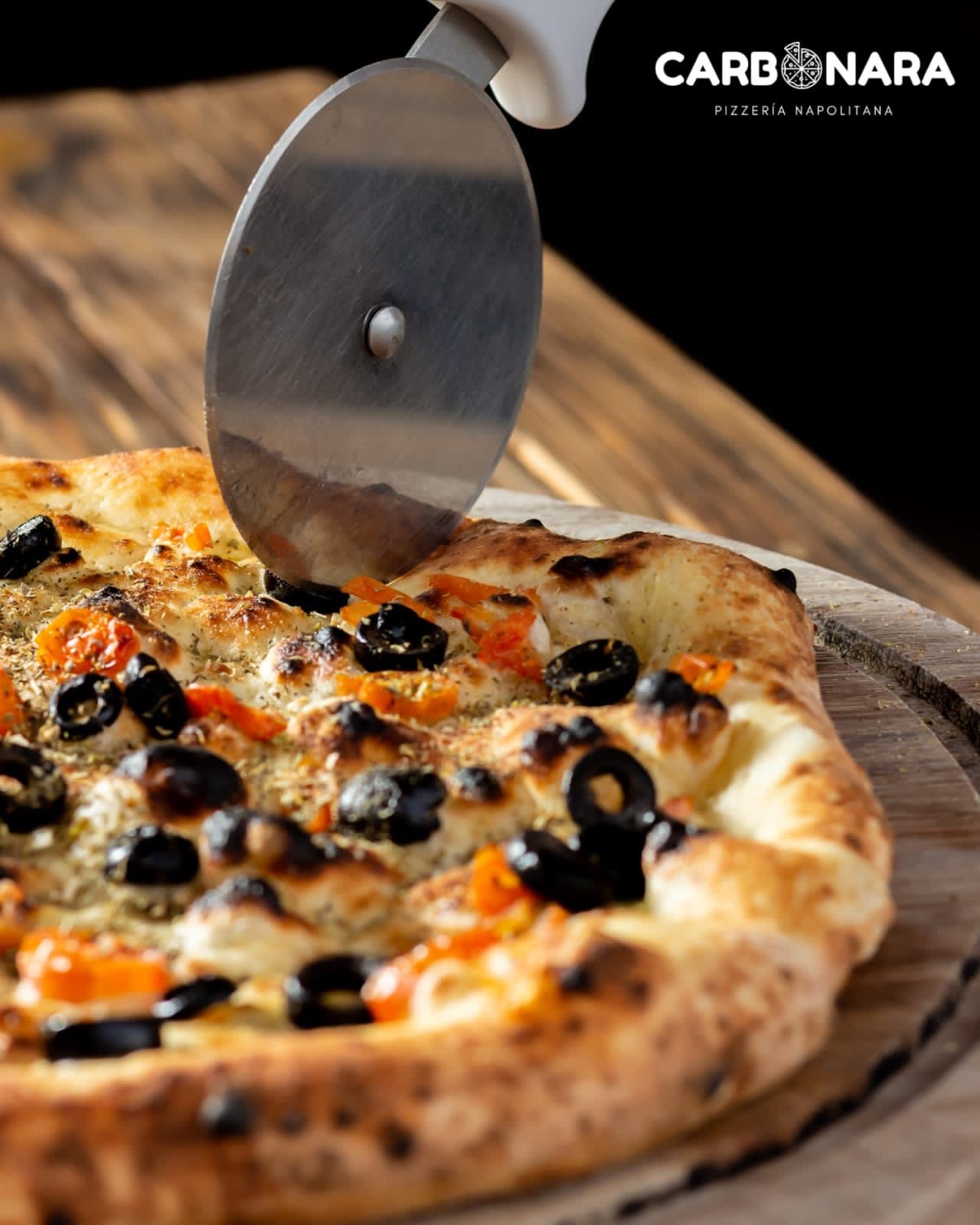 Pomodoro italiano, mozzarella, chorizo, champiñón, pimiento morron asado, aceitunas, cebolla morada.