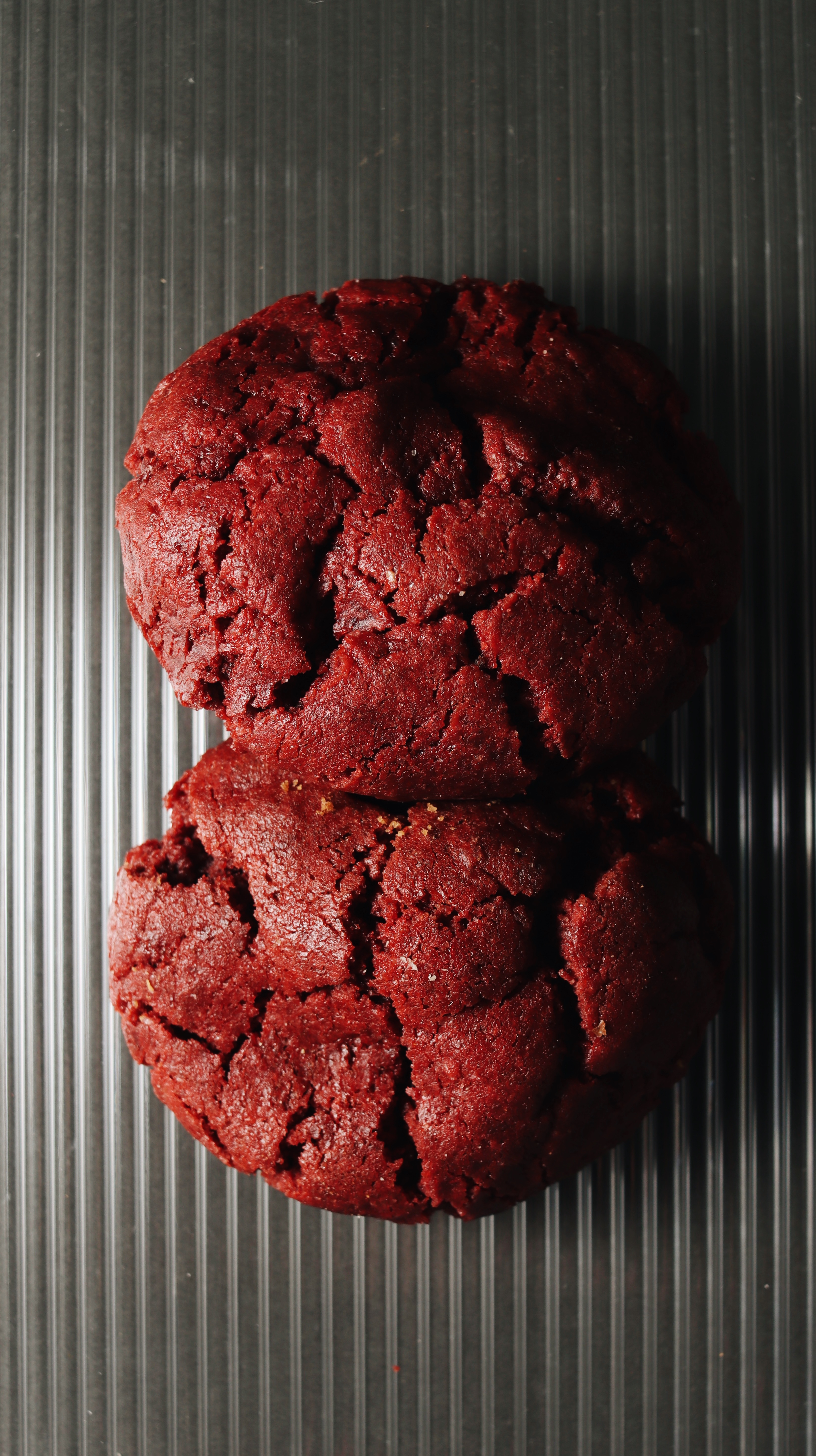 Galleta red velvet crujiente con relleno cremoso de cheescake. Roja muy roja.