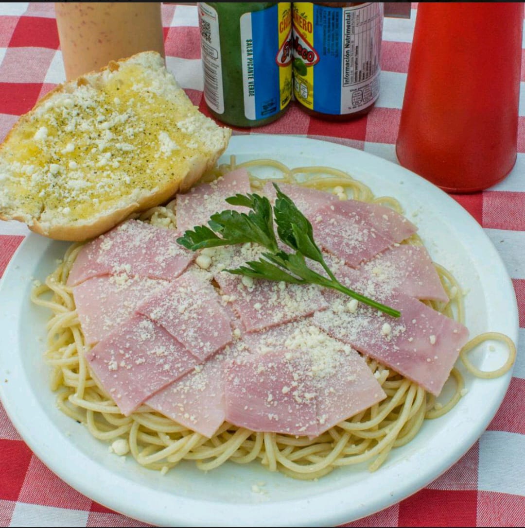 Personal, jamón, salami, champiñón, cebolla, piña y chile dulce.