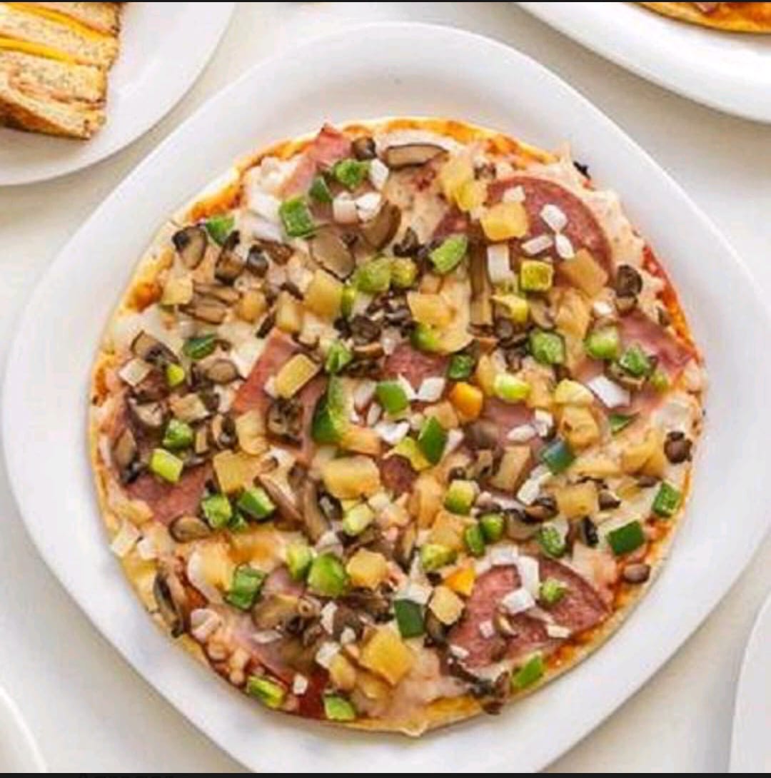 Personal, champiñones, piña, chile dulce, cebolla, granos de elote y doble queso.