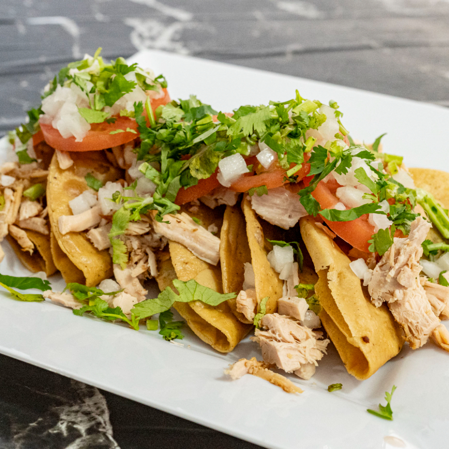 tacos dorados rellenos de picadillo preparados con carnitas, jitomate, cebolla, cilantro,crema incluye 2 guarniciones (salsa roja toreada y salsa verde guacamole)