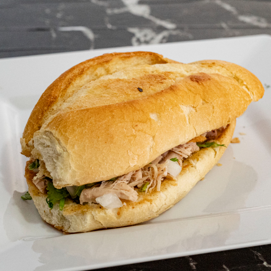 Torta de carnitas con cebolla y cilantro incluye 2 guarniciónes (salsa roja toreada y salsa verde guacamole)