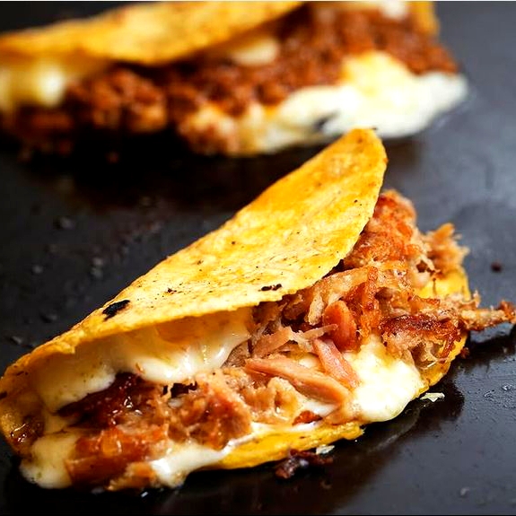 tortilla de comal de maíz , queso fundido y deliciosa carne cebolla y cilantro incluye 2 guarniciónes (salsa roja toreada y salsa verde guacamole)