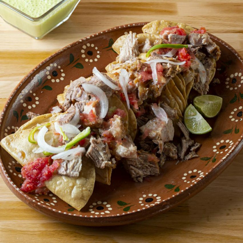 5 Piezas de tacos rellenos de carne molida, 150 gr de carnitas, salsa de jitomate, salsa de aguacate y ensalada de cebolla.