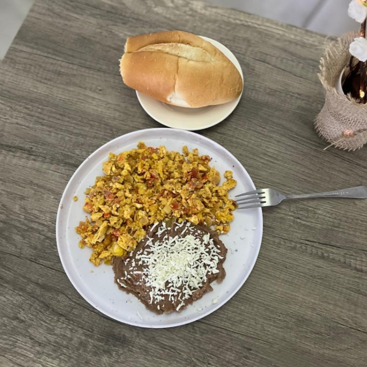 Huevos frescos preparados como mas te gustan: revueltos estrellados, servidos con frijoles refritos