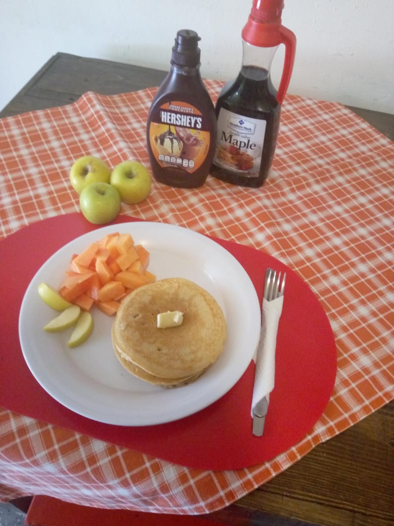 3 Piezas de hotcakes acompañado de fruta fresca.