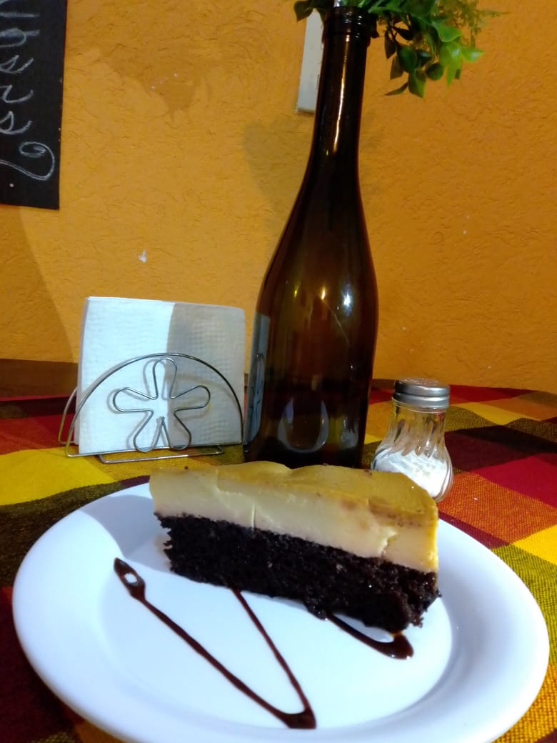 Exquisito postre compuesto por dos capas. Una de flan y otra de bizcocho de chocolate.