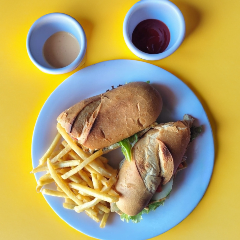 Sándwich de milanesa con verdura y aderezo de la casa.