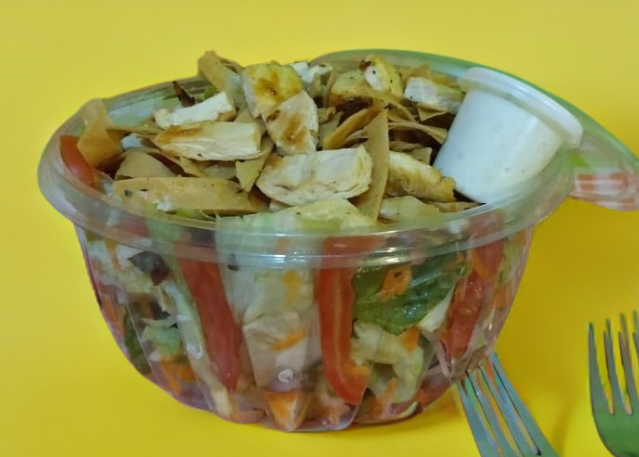 Preparada con mezcla de lechugas, jitomate, pepino, zanahoria, cebolla, pechuga asada y aderezo ranch.