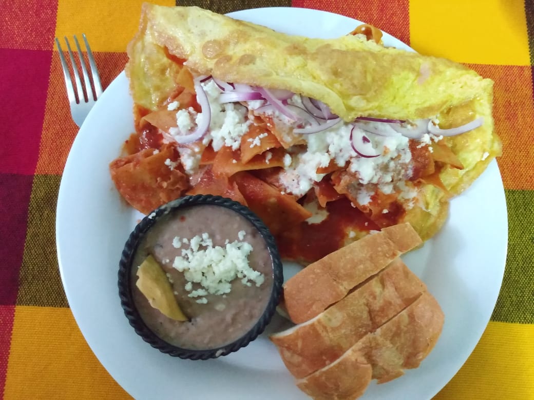 Combinación de chilaquiles con omelette.