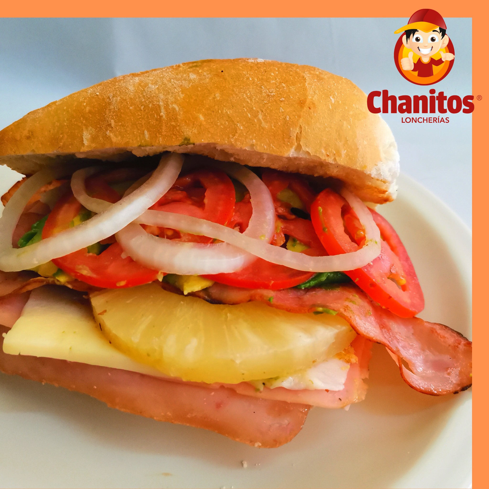 Jamón, piña, queso blanco y amarillo. Incluyen lechuga, jitomate, cebolla, aguacate, crema. Aderezos; catsup, mostaza y chimichurri.