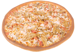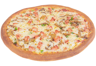 Champiñones, jamón, pimiento verde, cebolla y extra queso.