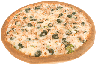 Atún, pimiento verde, cebolla, aceitunas y extra queso.