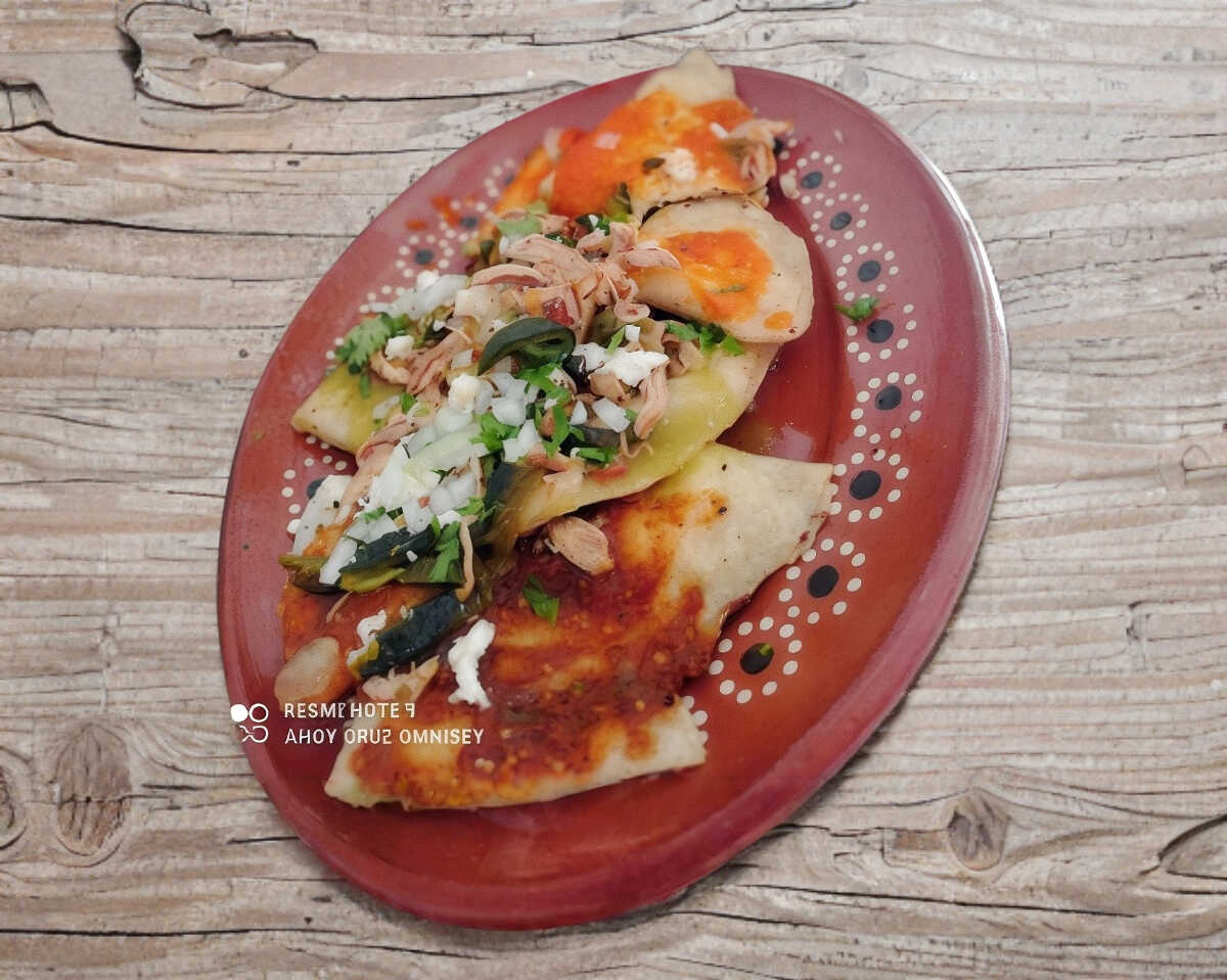 Totopos dorados de masa, relleno de queso asadero, bañados en salsa a tu gusto, frijoles, lácteos y verdura a elegir