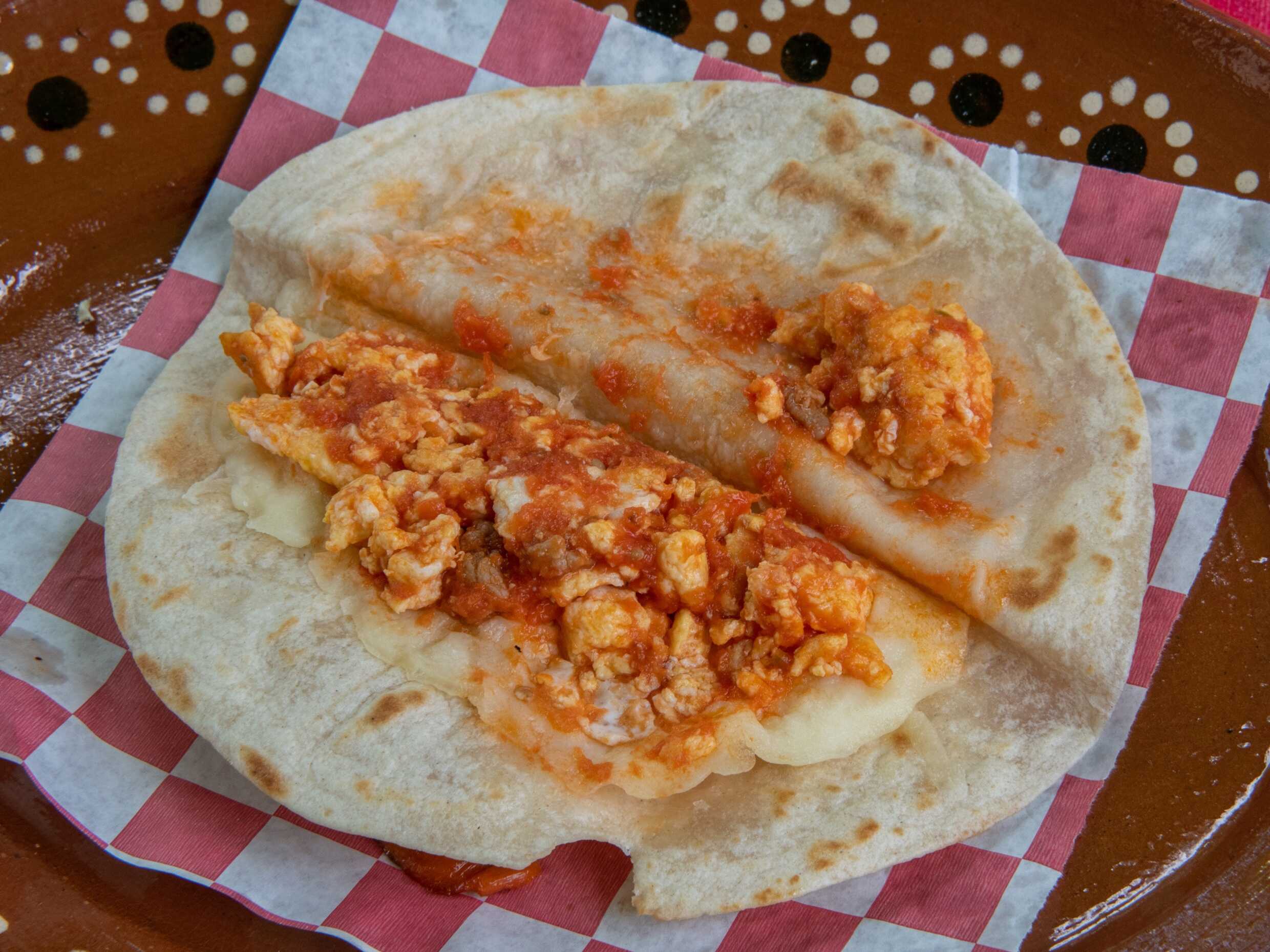 4pz, tortilla rellena de pollo, con salsa morita, queso asadero gratinado, frijoles, lácteos y verdura,