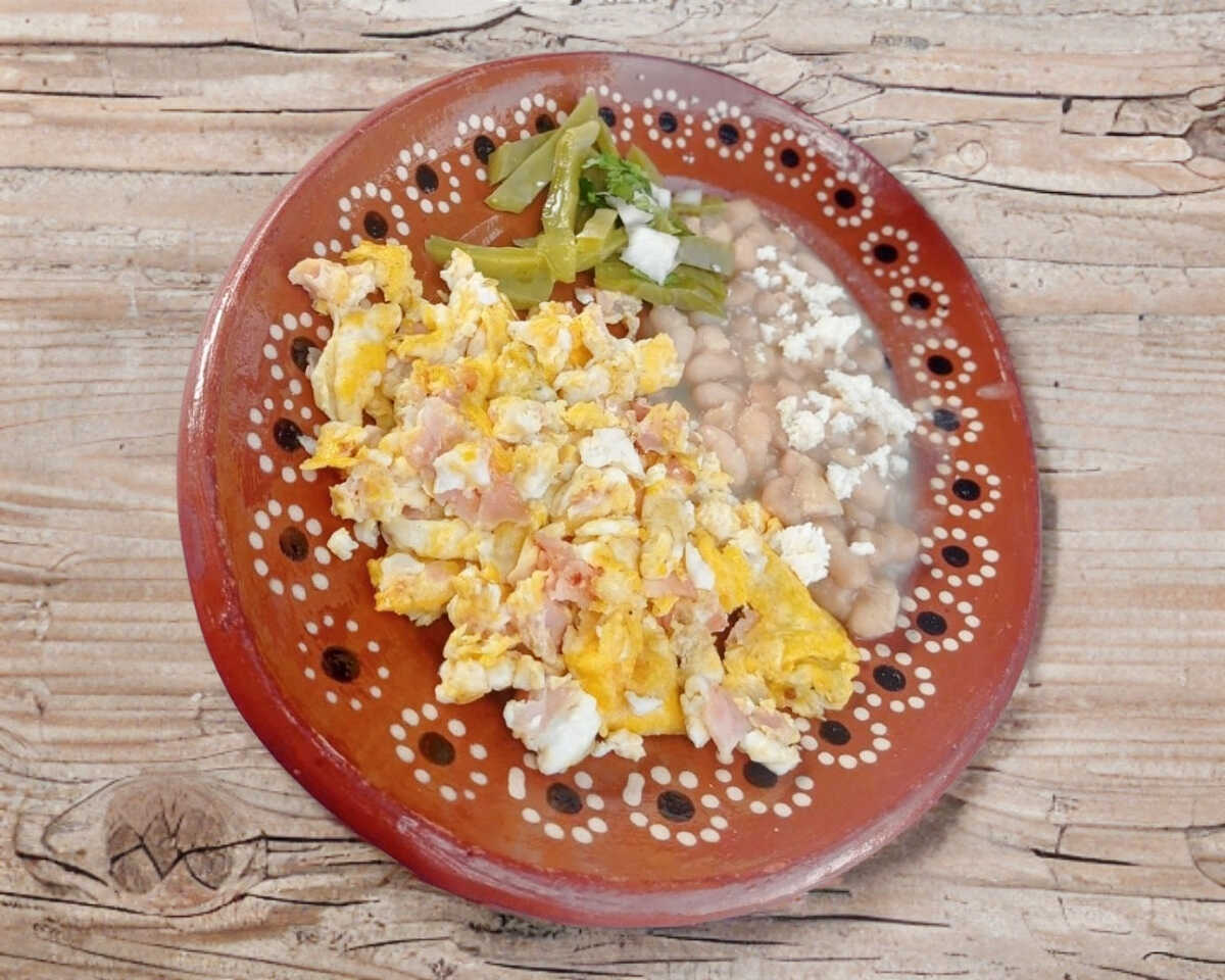 2 Huevos al gusto acompañados de frijoles, proteína, ingredientes y guisado extra.