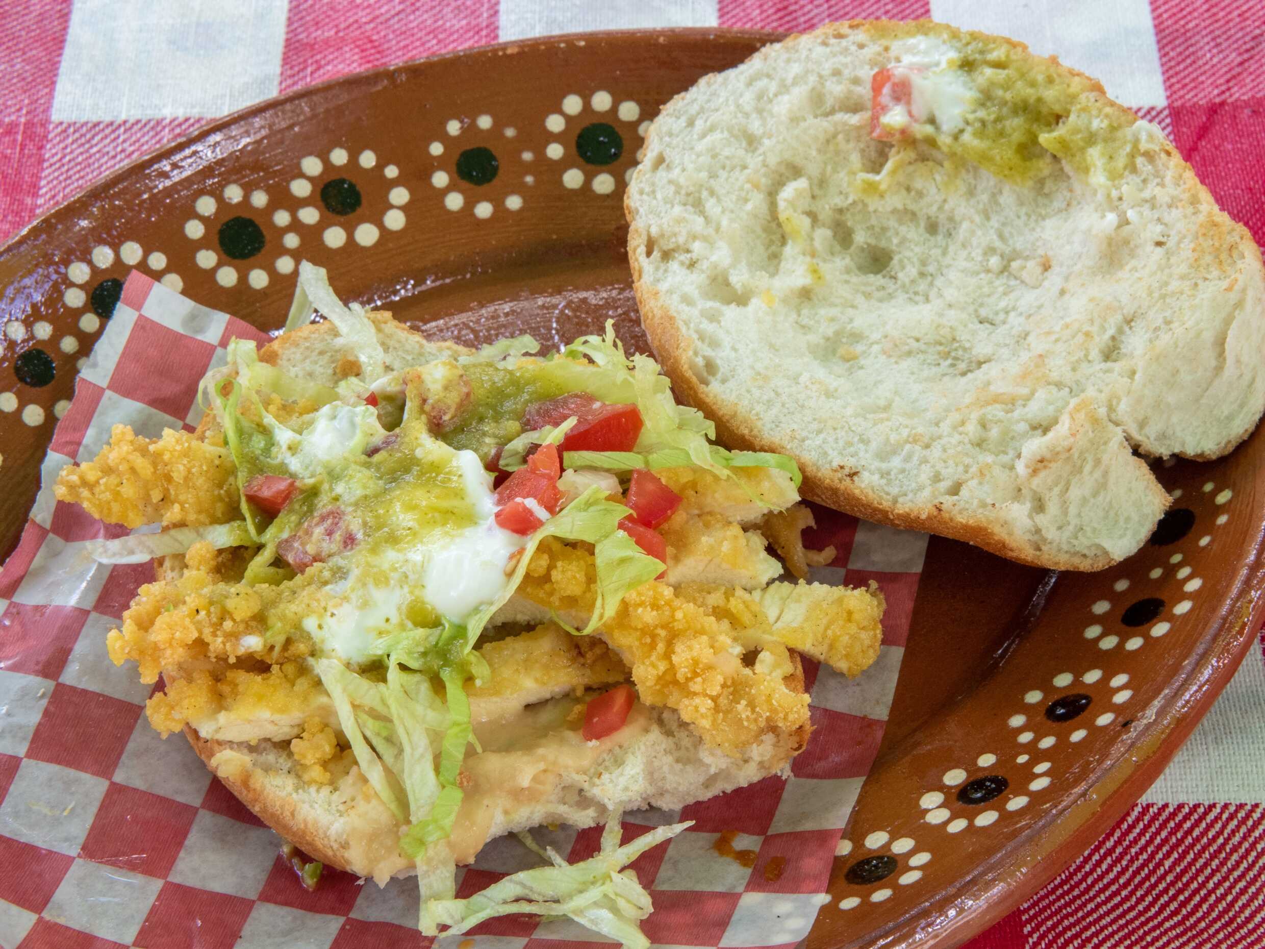 Bolillo ligeramete tostado en comal, relleno de totopos bañados en salsa a tu gusto, queso asadero gratinado, frijoles, lácteos, verdura con proteína a elegir