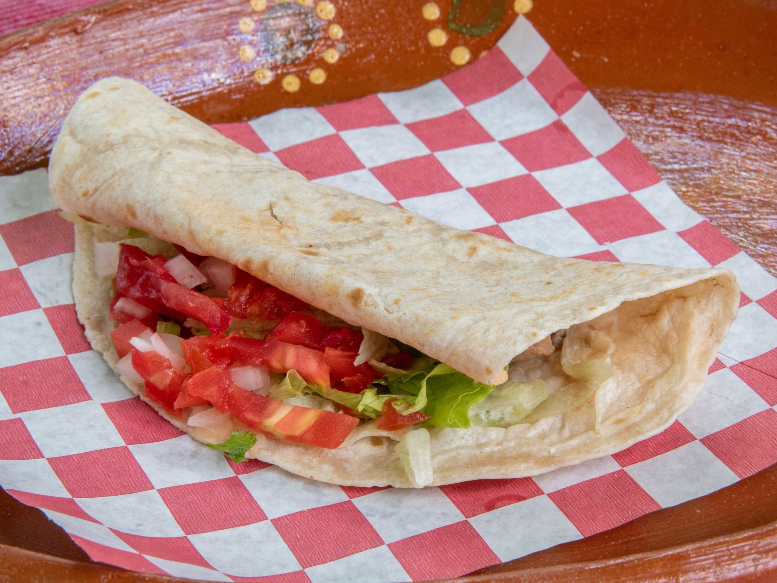 Tortilla de harina frijoles verdura y guisado a elegir.
