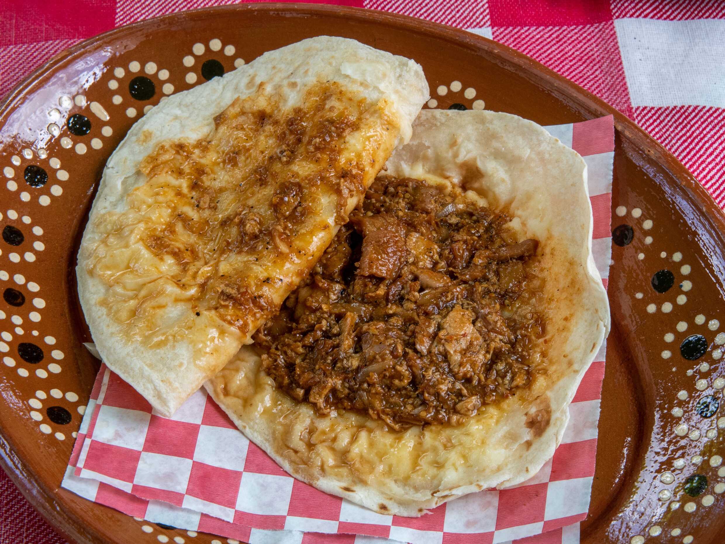 2 Tortillas de harina empalmadas queso asadero verdura y un guisado a tu gusto.