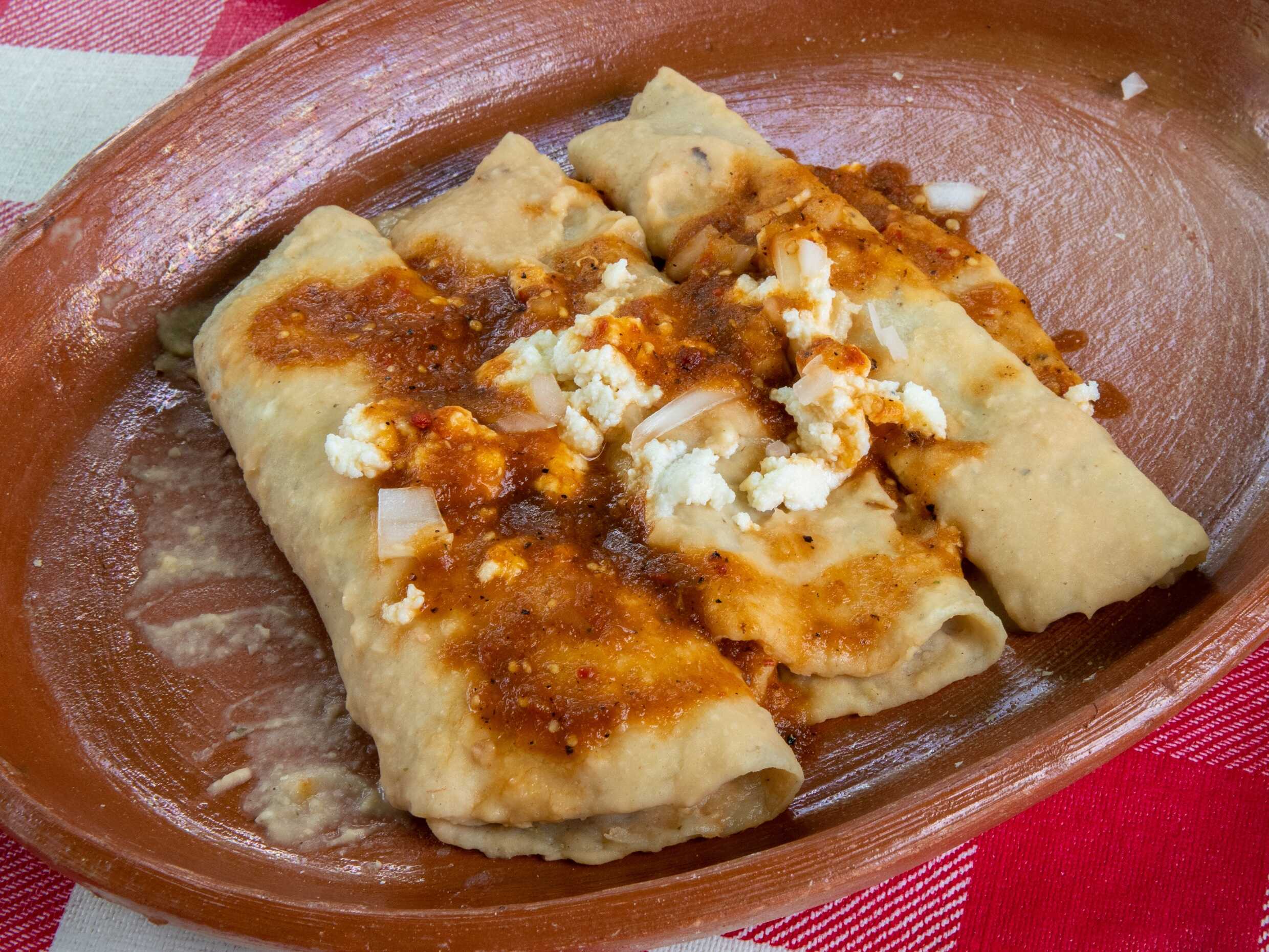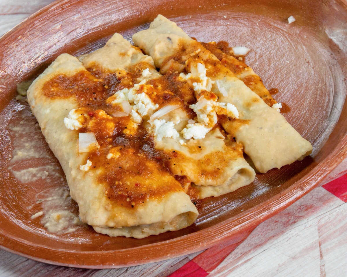 4 pzas de tortilla rellenas de queso blanco, bañadas de frijoles, lácteos y verdura a elegir