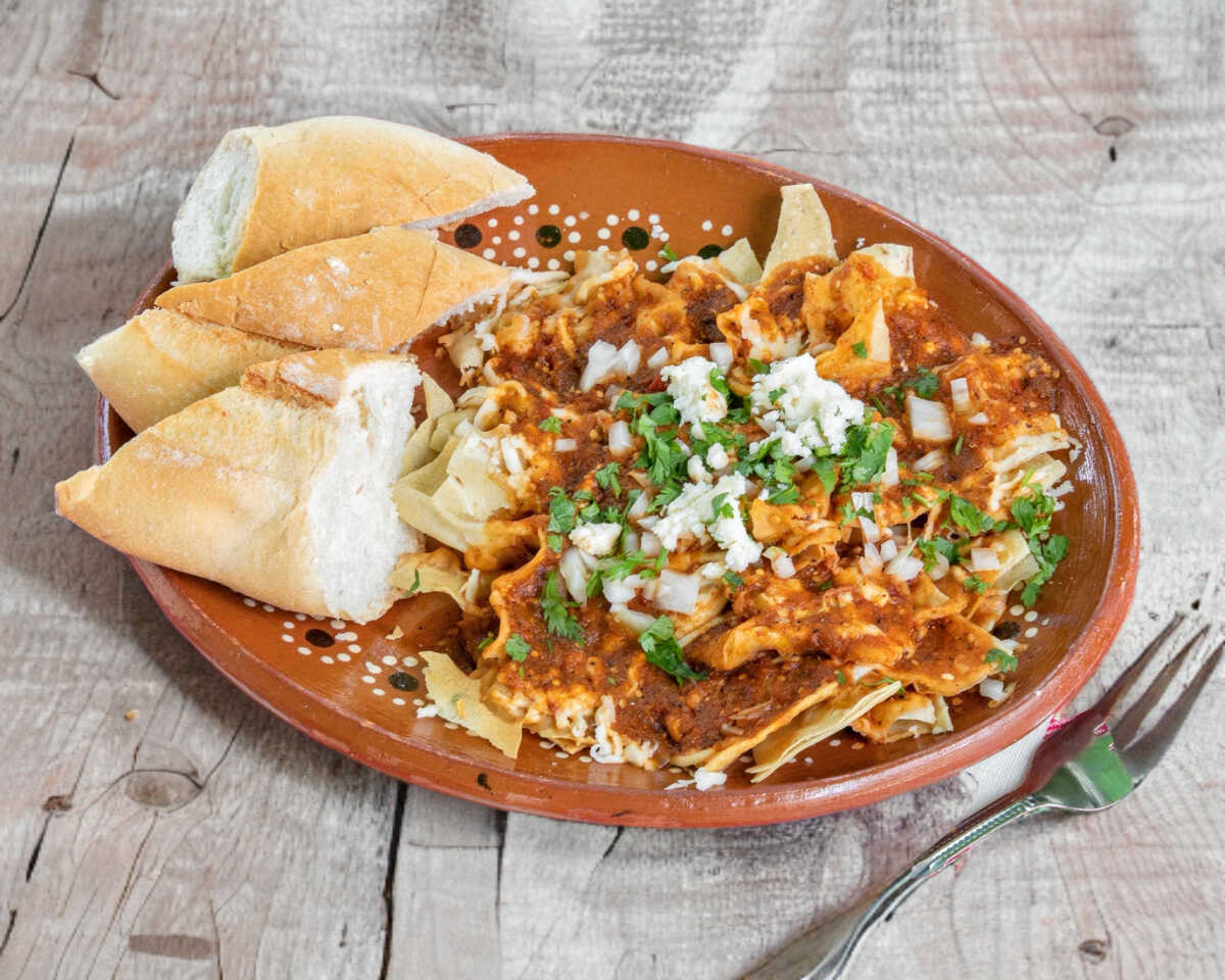 Bolillo ligeramente tostado en comal, rellenó de totopos bañados en salsa a tu gusto, queso asadero gratinado, frijoles, lácteos y verdura a elegir.