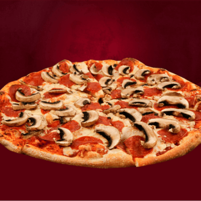 Una pizza grande con masa fina y crujiente, salsa de tomate y una deliciosa combinación de pepperoni y champiñones. Hecha con ingredientes frescos y de alta calidad para un sabor inigualable.