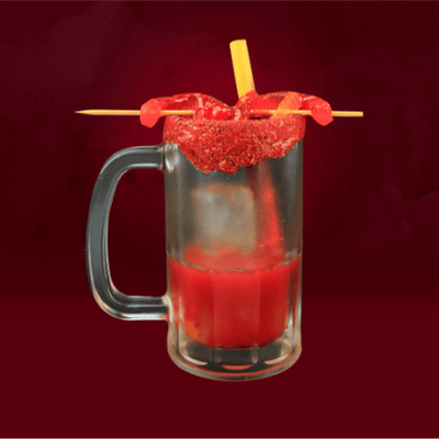 Preparado con sal, jugo de limón, chamoy en polvo, chamoy líquido, pulpa de mango, pulpa de tamarindo y popote con tamarindo. No incluye tarro y crveza.
