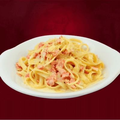 Espaguetti o fetuccine a la mantequilla con jamón y tocino a la crema.