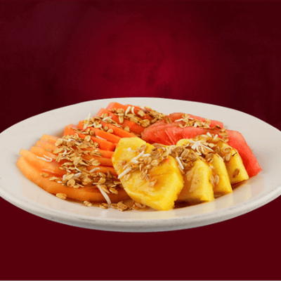(4 Frutos a escoger). papaya, sandia, melón, plátano, piña, fresa, kiwi y manzana. acompañado con granola, avena y yogurt natural o fresa.