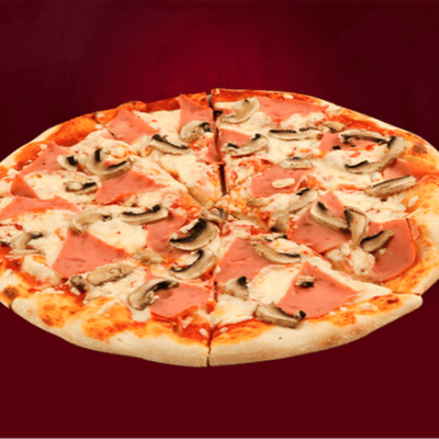 Una pizza grande con masa fina y crujiente, salsa de tomate, y una combinación deliciosa de jamón y champiñones. Elaborada con ingredientes frescos y de alta calidad para un sabor auténtico.