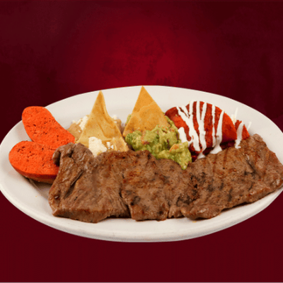 220 Gr de exquisito filete, acompañado chorizo asado, frijoles refritos, guacamole y una enchilada roja.
