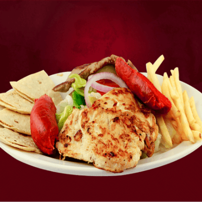 130 Gr de pollo a la plancha, 130 gr arrachera, 2 pz de chorizo asado y 2 quesadillas, acompañado con ensalada clásica y papas a la francesa.