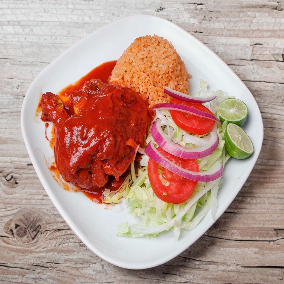 1/4 de Pollo bañado en nuestra deliciosa Salsa Poblana, acompañado de espaguetti verde, arroz o sopa; ensalada de lechuga, salsa y tortillas