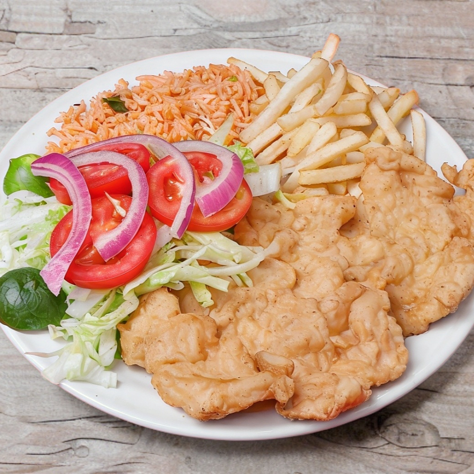 Milanesa de pechuga de pollo, acompañada de arroz, sopa o espaguetti; ensalada de lechuga, papas a la francesa, salsa y tortillas.