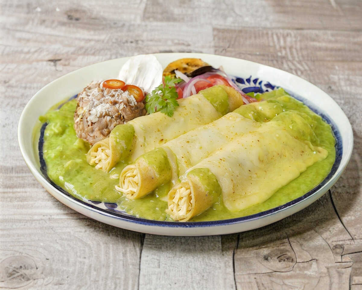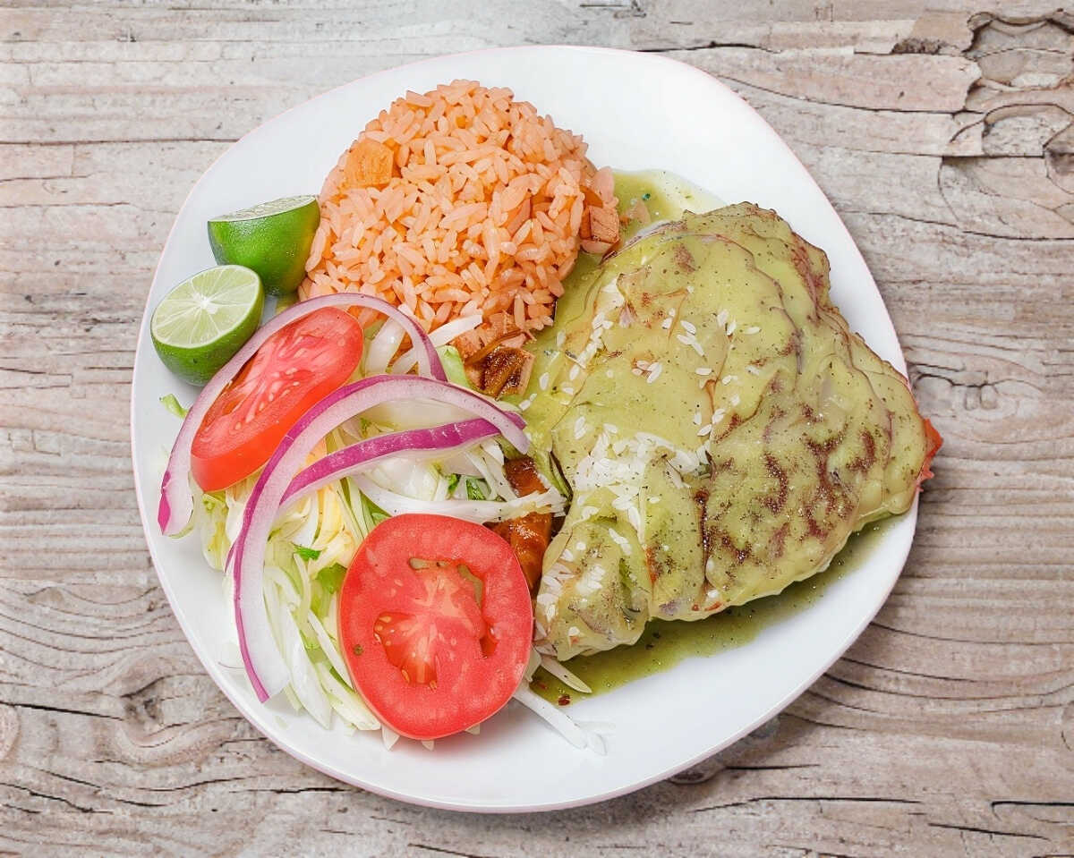3 Enchiladas Rojas ó Verdes de Pollo y/o de Queso; acompañadas de arroz, ensalada de lechuga y salsa.