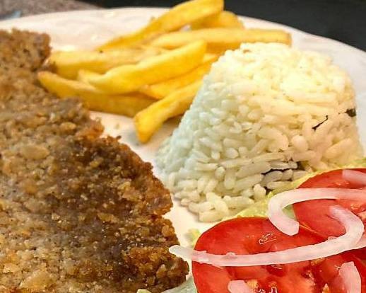 Milanesa de res acompañada de arroz blanco y ensalada de lechuga, jitomate y cebolla o papas a la francesa y 3 tortillas de maíz.
