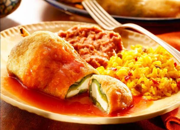 Chile poblano capeado y relleno de queso Asadero, acompañado de arroz rojo, ensalada de lechuga, jitomate, cebolla y 3 tortillas de maíz