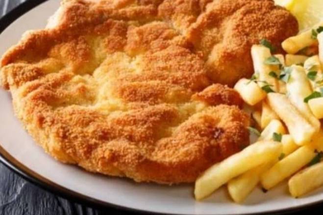 Milanesa de pollo acompañada de espagueti blanco en crema y ensalada de lechuga, jitomate y cebolla o papas a la francesa y 3 tortillas