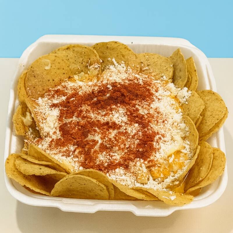 DELICIOSOS NACHOS CON ELOTE. servido con mantequilla, mayonesa, chile en polvo, limon, crema, queso amarillo y queso rayado