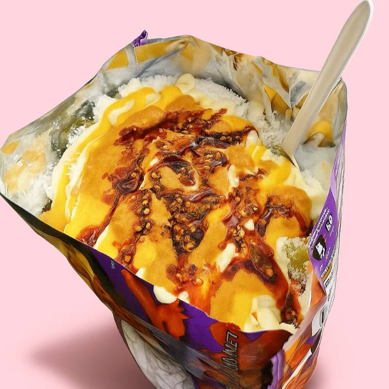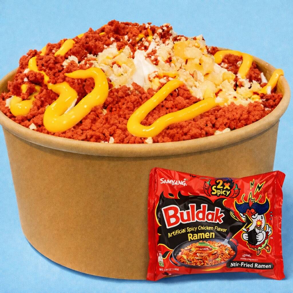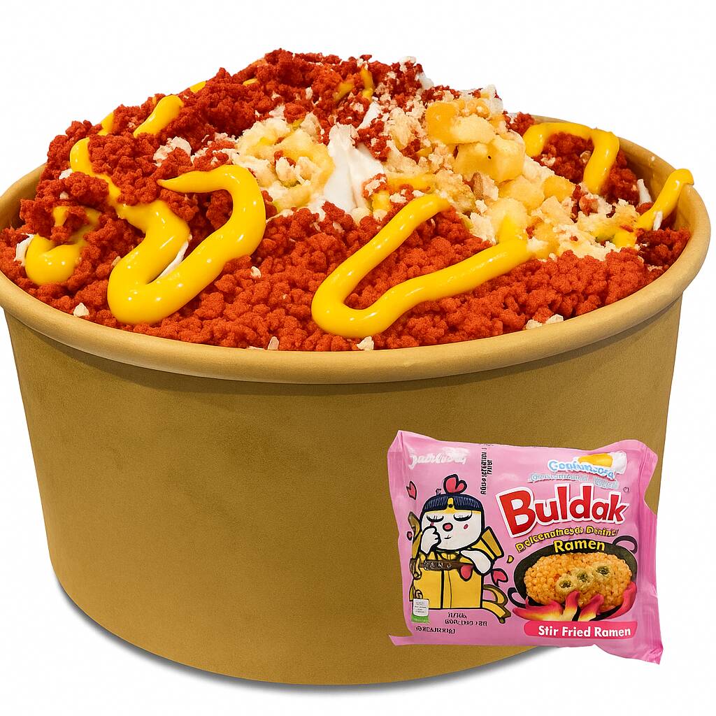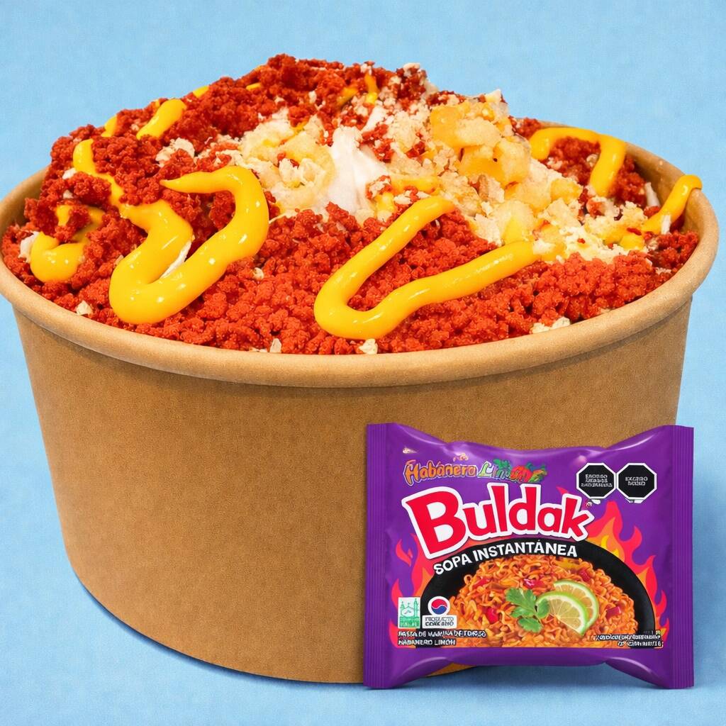 DELICIOSO RAMEN BULDAK SERVIDO CON ELOTE Y CHEETOS FLAMIN HOT PROCESADOS.