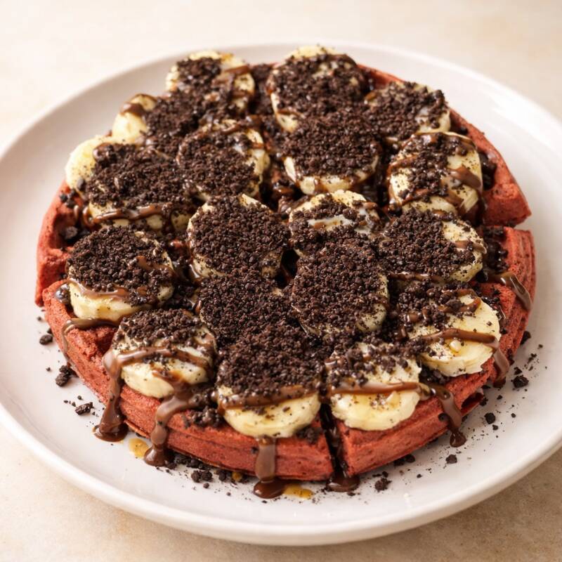 DELICIOSO WAFFLE DE MASA DE RED VELVELT CON PLATANO, LECHERA, CHOCOLATE Y OREO TRITURADA