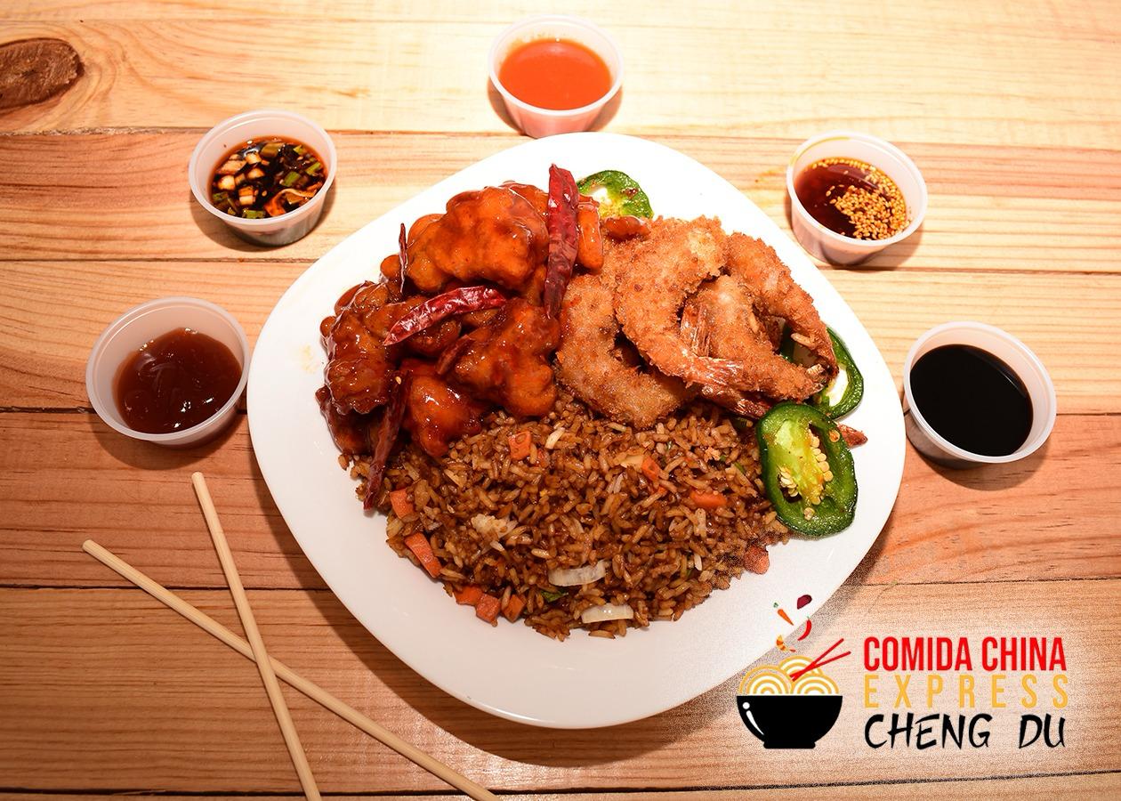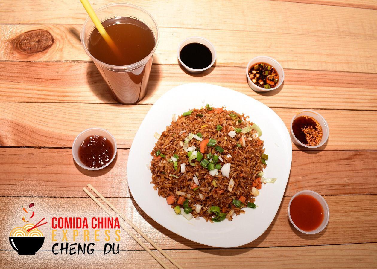 Arroz frito o espagueti, 2 guisados (entre 12 que hay elige el que mas te guste).