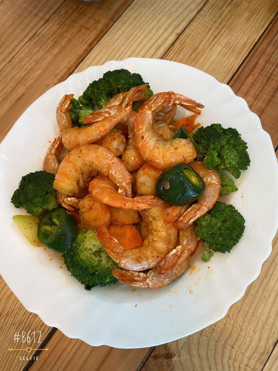 Camarón Grande Guisado y Arroz o Espagueti