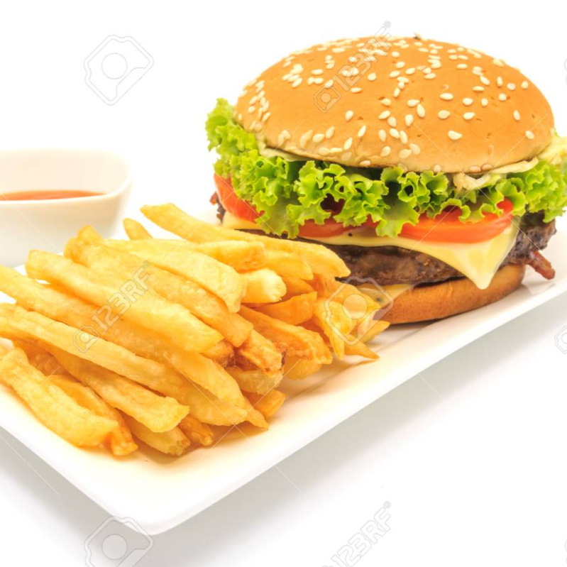 Rica hamburguesa con cebolla, jitomate, lechuga, queso, jalapeño, mayonesa, catsup y con papas