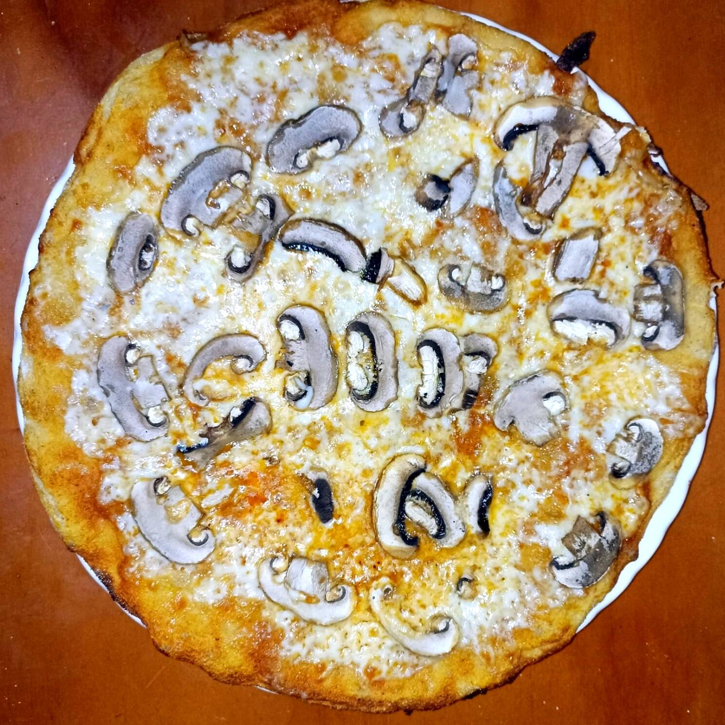 Pizza hecha con masa madre, champiñones frescos rebanados, salsa de tomate con albahaca y queso mozzarella.