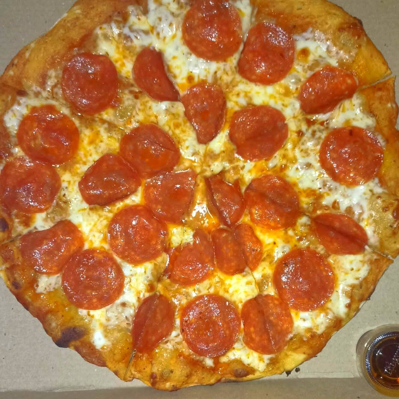 Pizza hecha con masa madre, salsa de tomate con albahaca, pepperoni tipo americano y queso mozzarella.