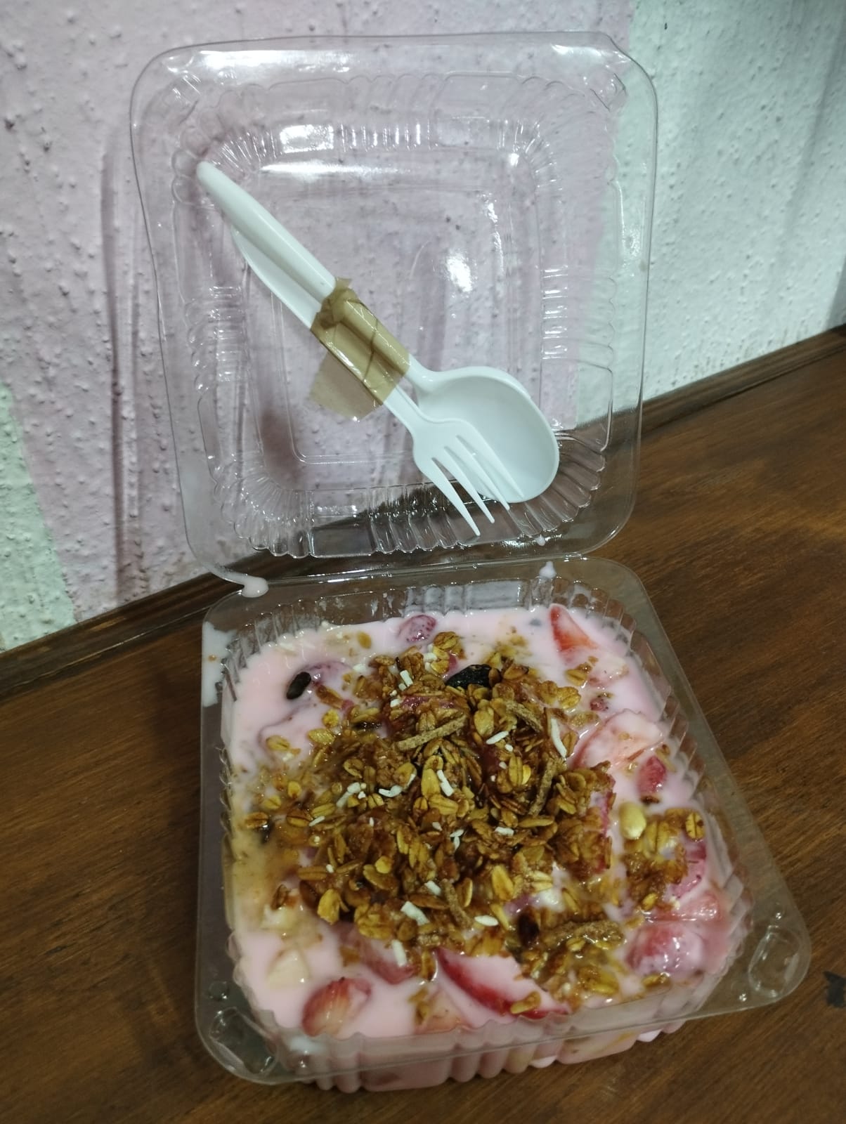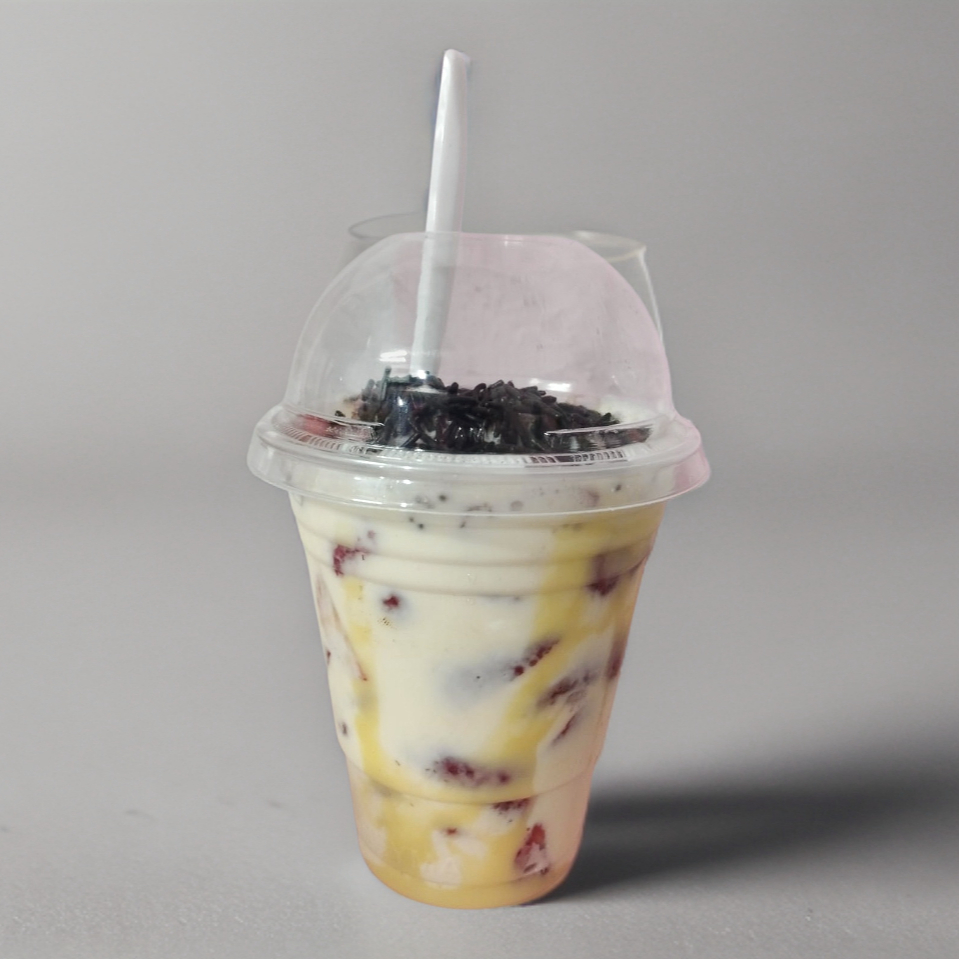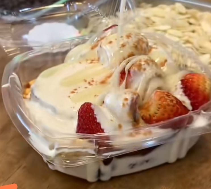 Plato surtido de frutas al cual se le agrega crema de la casa o yogurt sabor fresa, y a elección del cliente cobertura y topping.