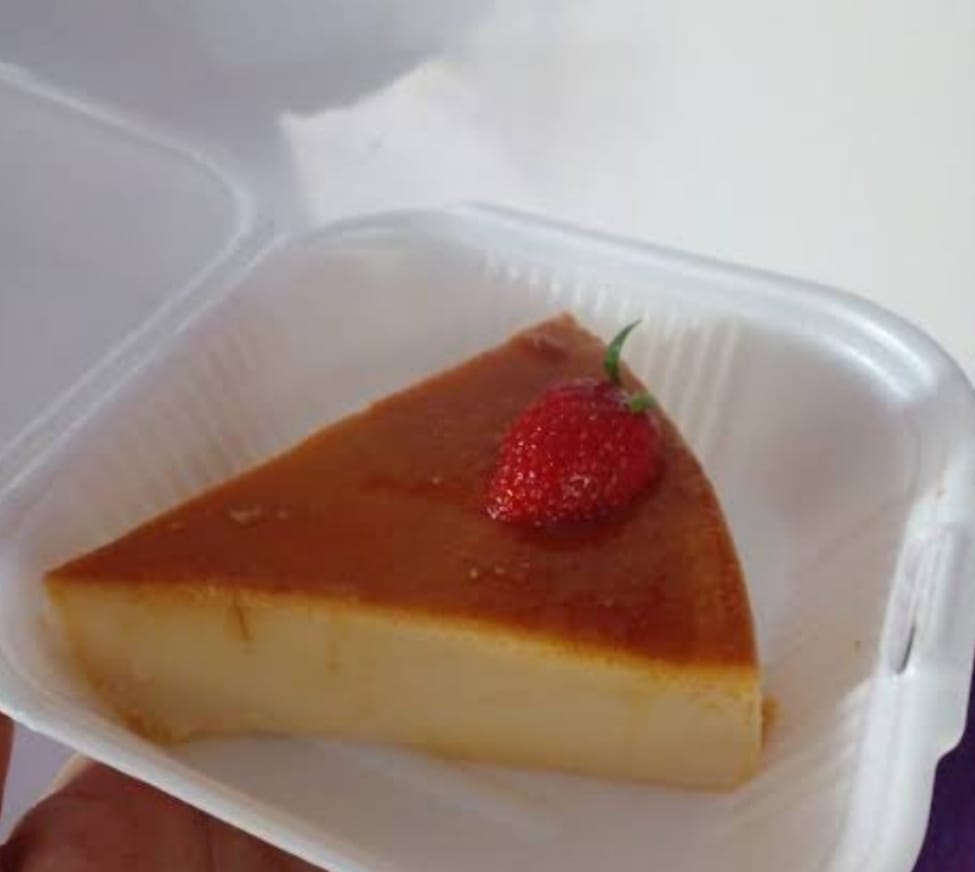 Una rebanada de flan napolitano de aproximadamente 300 a 340 g. Receta secreta de la casa acompañada de fresas con crema. cobertura a elección y topping.
