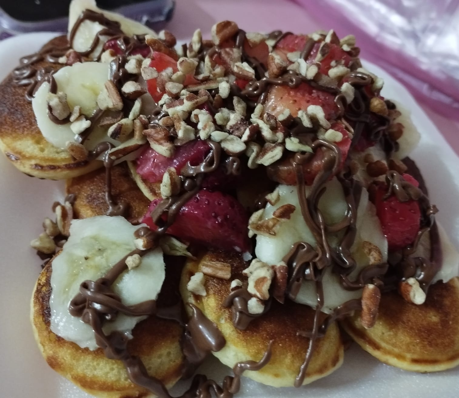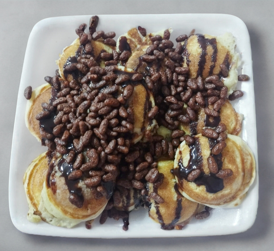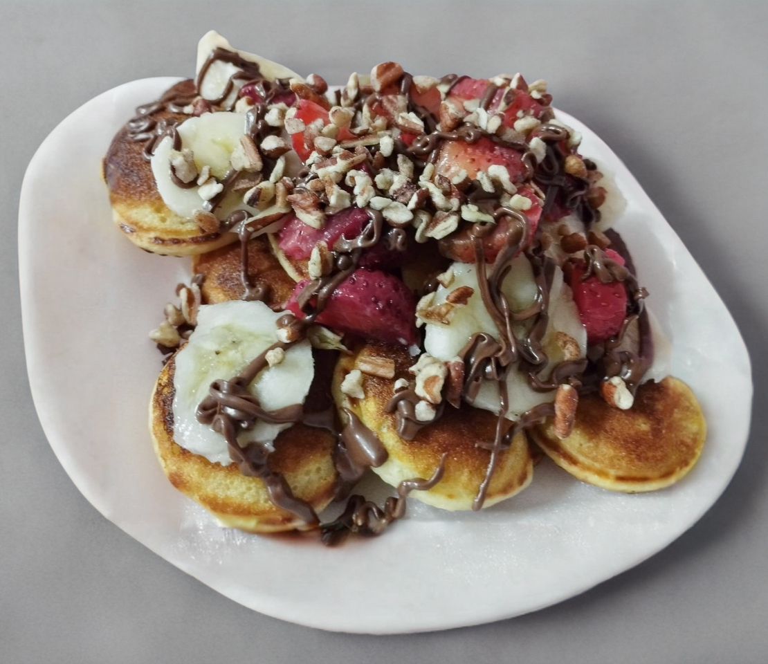 Mini panquecitos hechos a base de harina de hot cakes, tradicionales, la orden contiene 12 pzas, a la cual se le agrega 3 frutas de tu elección, 2 coberturas, 1 topping y opcional crema batida y azúcar glas.
